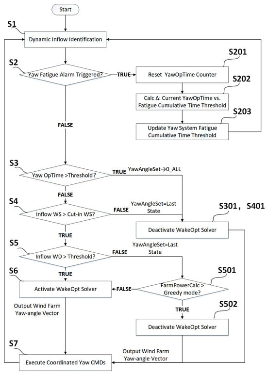 The procedure begins with dynamic inflow identification (S1), where free-stream wind data are analyzed to extract prevailing wind characteristics such as direction and speed. This foundational step ensures all subsequent control decisions align with current atmospheric conditions. Running in parallel, the fatigue monitoring module (S2) continuously evaluates yaw system usage to flag excessive mechanical stress through a dedicated fatigue alarm. This module acts as a structural safeguard, regulating actuation to protect long-term system health. Upon activation of the fatigue alarm, the controller initiates a three-step mitigation protocol aimed at rebalancing the yaw duty cycle: (S201) resets the yaw operation time (YawOpTime) counter to zero, (S202) computes the deviation between the cumulative yaw time and the allocated fatigue budget for the current procedural cycle, and (S203) updates the next cycle’s fatigue quota by adjusting it with . Here, a positive indicates overuse, triggering a proportional deduction from the next cycle’s quota, while a negative reflects underuse and permits a compensatory increase. Together, these adjustments enable adaptive balancing of the fatigue quota across successive control cycles. Importantly, even in alarm-free states, the fatigue threshold dynamically evolves to reflect changing operational loads, fostering both structural longevity and control responsiveness. At decision node S3, “”, the control logic diverges. If the threshold is breached, the system triggers a global yaw neutralization routine by assigning zero yaw angles to all