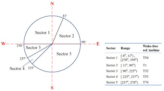 Through rotating coordinate alignment, turbines positioned furthest upstream under specific wind directions are prioritized as first-order reference units, which are free of wake influence. This wind farm’s spatial configuration and 360° directional analysis systematically define first-order turbines for distinct wind sectors(see Figure 3). Each sector is assigned a specific angular range to ensure full directional coverage. For instance, Sector 1 covers the intervals from 0° to 11° and from 270° to 359°. A tabular list systematically maps sectors to wake-free reference turbines (T54, T1, T32, T53, and T74), prioritizing upstream units under corresponding wind directions. During real-time operation, when the measured wind direction falls within a given sector, the free-stream wind speed is sourced exclusively from the anemometer of the sector’s assigned reference turbine. This turbine provides validated inflow conditions for downstream wake steering control.