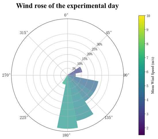 The processed dataset corresponds to a prevailing southeasterly wind regime, ranging from 135° to 180°, with average wind speeds predominantly between 0.4 and 9.6 m/s. Notably, wind direction frequencies peak between 158° and 180°, accounting for 25%–30% of all observations, as illustrated by the light teal sectors in the wind rose diagram (Figure 4). This directional consistency both validates the interpolation approach and offers a representative operating envelope for calibrating the wake steering controller under typical inflow conditions.