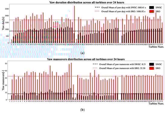 The comparative performance of SWSC and SRO control strategies is quantitatively demonstrated in Figure 5. The upper subplot Figure 5a highlights a significant reduction in yaw system workload under SWSC management: the mean daily yaw actuation time per turbine is reduced from 1686.92 s (SRO) to 868.41 s, representing a 48.5% decrease. Notably, SWSC maintains yaw adjustments below 1210 s for all turbines (black bars), while temporal accumulation exceeding 2000s is observed in 11 SRO units (red bars). The lower subplot Figure 5b further supports this finding by comparing the yaw maneuver frequency. SWSC averages 8.21 yaw operations per turbine per day, dramatically lower than the 32.30 operations/day recorded under SRO, a 74.6% reduction. This benefit is particularly pronounced among upstream turbines (T3–T30), where SWSC restricts daily maneuver counts to fewer than 15, compared to SRO peaks reaching 30–50 operations/day. Both metrics collectively verify SWSC’s capacity to alleviate yaw system fatigue through its fatigue-aware supervisory scheduling logic.