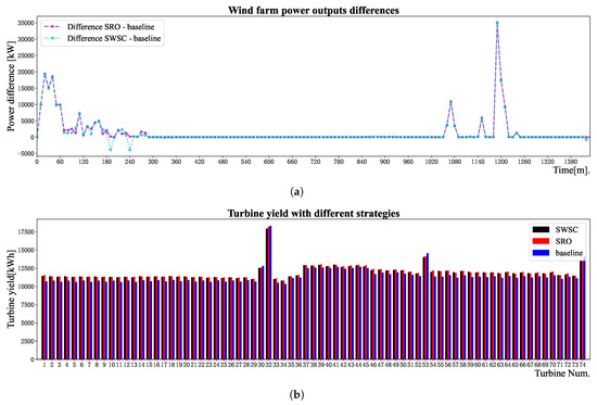 Figure 6a illustrates the 24-h temporal profile of net power output differentials between the SRO (purple) and SWSC (cyan) strategies, with both evaluated relative to the baseline greedy-mode operation. Both strategies demonstrate significant power gains (0–35,000 kW range) during active wake steering phases. Remarkably, SWSC matches SRO’s performance for the majority of the time, indicating comparable control efficacy under normal operating conditions. Notably, SWSC strategically reduces optimization activity under specific boundary conditions: