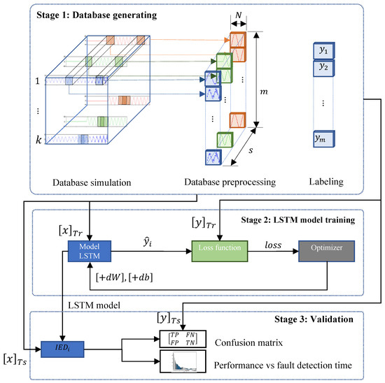 The database generation process is divided into three main steps: database simulation, minibatch creation, and labeling. Each of these steps is crucial to ensure that the LSTM models are trained with representative data, enabling them to effectively detect faults in the ADN.