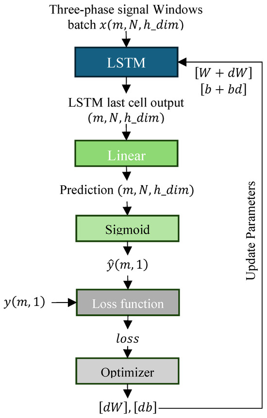 In the second step, the dataset is divided into minibatches of dimension to optimize the training process. Here, N represents the number of samples per window, m denotes the number of windows per batch, and s corresponds to the recorded current signals. These windows are extracted from each simulated event, capturing one cycle at 60 Hz and ensuring a sampling frequency of 3840 Hz. The resulting dataset has a dimension of , as depicted in Stage 1 of Figure 3.