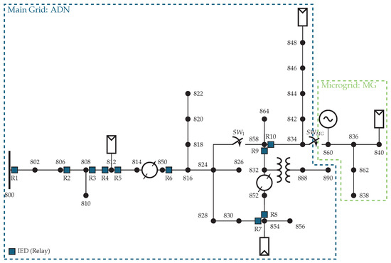 The proposed strategy was validated by training 10 LSTM models as fault detectors, which were integrated into the 10 IEDs installed in the ADN. Figure 5 illustrates the modified network, including the placement of IEDs and DERs.
