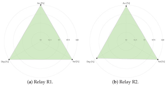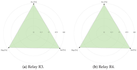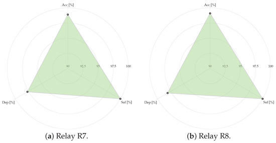 The indicators of accuracy, dependability, and safety for each relay, defined in Equations (9)–(11), are summarized in Table 10. These metrics provide a quantitative evaluation of the fault detection strategy.