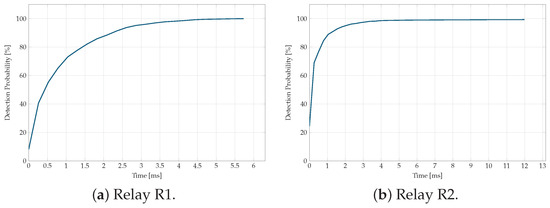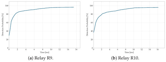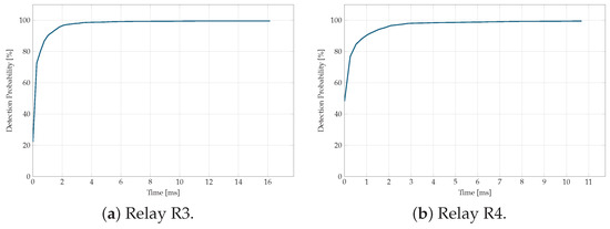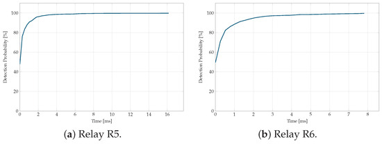 An important aspect of the fault detection strategy is the speed at which the LSTM models identify fault events. Figure 11, Figure 12, Figure 13, Figure 14 and Figure 15 illustrate the detection probability as a function of detection speed for each relay.