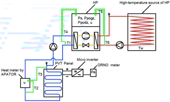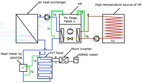 A schematic of the second variant of the experiment is shown in Figure 3. The two systems differ with regard to the presence of a hydraulic circuit of the low-temperature source of heat of the HP. The auxiliary air heat exchanger module is omitted in this variant, so that the PVT collector is responsible for all the thermal energy from the low-temperature heat source.