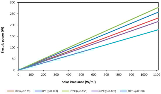 Graph of theoretical electric power generated as a function of solar radiation intensity for different operating temperatures of the PV panel [developed based on the data provided in the PVT module datasheet].