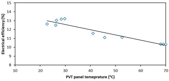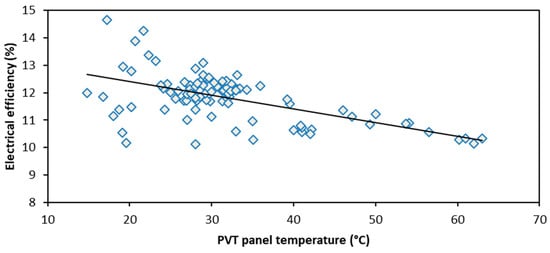 Figure 5 shows the correlation between the electrical efficiency of the system and the temperature of the panel under test. This is the total efficiency of the system, i.e., of the PVT panel and the inverter. Its average value is 11.81%. It can be seen in the graph that the efficiency decreases with increasing temperature, and the rate of the decrease is −0.37%/°C.