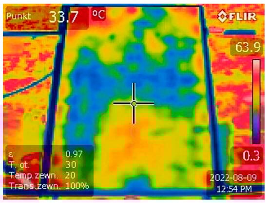 The efficiency graph also reveals a large discrepancy in the values of efficiency at low cell temperatures. This is caused by the uneven heat transfer from the cells, which was the most significant issue in the study. An overview infrared image of the panel is shown in Figure 6, where the variation in cell temperature of the entire PVT panel can be observed.