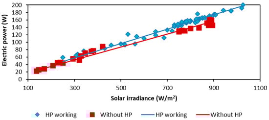 Based on the data collected, curves were plotted for the correlation between the power generated and the intensity of solar radiation during heat pump (HP) operation (blue) and without HP operation (red). These curves are shown in Figure 7. The efficiency values calculated on this basis are 12% at an average cell temperature of 28.5 °C and 10.8% at an average cell temperature of 40 °C. An 11.4% improvement in electrical output was observed for the photovoltaic panel cooled by the heat pump compared to the system operating without thermal regulation. Such an increase in efficiency is impressive; however, it should be noted that even better performance can be achieved by cooling photovoltaic modules using alternative methods, such as pouring water over the modules. In the experiment described by Lubon et al., a 20% increase in generated electrical energy was achieved [65].