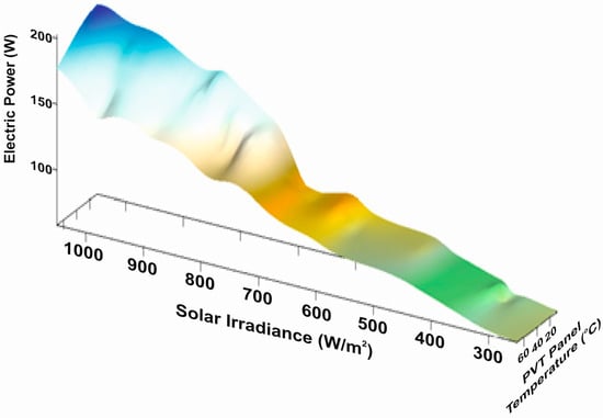 Three-dimensional plot of the correlations between power, solar irradiance, and PVT panel temperature.
