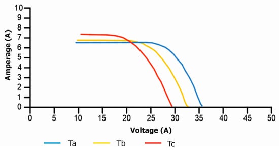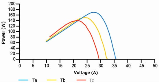 Based on the data collected, lines were plotted to show the correlation between power and solar irradiance. The graph with the lines is shown in Figure 10. The data collected were divided into three groups according to temperature. The first group, Ta, was marked in blue. It comprises the results collected during HP operation. The panel temperature for this group is low, between 22 and 30 °C, with an average value of 26.7 °C. The second group, Tb (orange marker), contains data collected at higher panel temperatures. They range from 41 to 53 °C. Their average value is 46 °C. The data belonging to this group were collected shortly after the heat pump was switched off, or in the morning before the panel warmed up. As a result, they have higher values. The last group, Tc (red marker), is made up of data collected during the hottest periods of the day, without the HP running. This group is characterized by the best temperature matching. The temperatures measured range from 68 to 71 °C. The average panel temperature for this group is 69.5 °C.