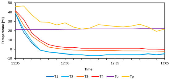 Figure 13 shows the temperatures as functions of time at the individual points in the low-temperature source system, the ambient temperature, and the panel temperature. The individual symbols, T1, T2, T3, and T4 correspond to the temperatures recorded in the different locations in the system, as shown in Figure 2 and Figure 3. To stands for the ambient temperature, and Tp for the temperature of the PVT panel cells read from the infrared images.