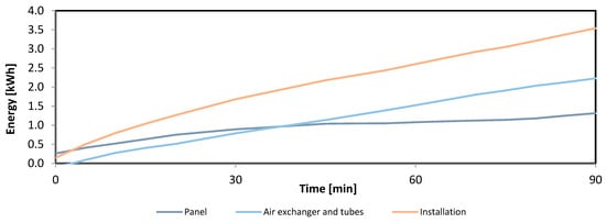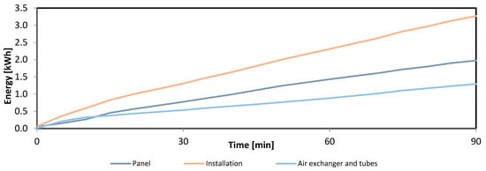 Experimental results indicated that the connecting pipes between the PVT module, the air heat exchanger, and the heat pump were exposed to solar radiation, consequently becoming an additional source of thermal energy for the heat pump system. Figure 14 and Figure 15 show graphs of cumulative thermal energy as a function of time. The first figure shows the energy generated when the system was operating with the air exchanger, while the second figure shows the results when the air exchanger was disconnected.