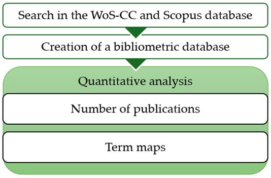 This review was conducted according to the methodology described in [2,4,5,28,29,30,31], using bibliometric techniques (see Figure 1). This analysis included searching indexed publications in the Web of Science—Core Collection (WoS-CC) and Scopus databases. The time range of the searched data was 2010–2024, and the language of the publications was limited to English. Documents of the type “article” were searched with the phrase “biomass*”, “densi*” and “pellets*” in the TITLE field.