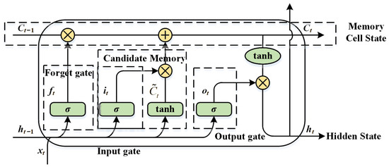 LSTM controls the memory information of time series data by adding memory cells to the hidden layer. Composed of three gates (input gate, forget gate, output gate) and a memory cell state, LSTM can better deal with long-term dependencies in the sequences. The key to LSTM is the cell state, which is similar to a conveyor belt. Running directly over the entire chain, with only a few linear interactions, it is easy for information to flow over it to remain constant. The LSTM model structure is shown in Figure 2.