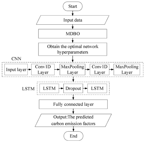 By integrating MDBO and CNN-LSTM, the issues of noise sensitivity and low computational efficiency in power system carbon emission factor prediction are expected to be addressed; a diagram of this is shown in Figure 3.
