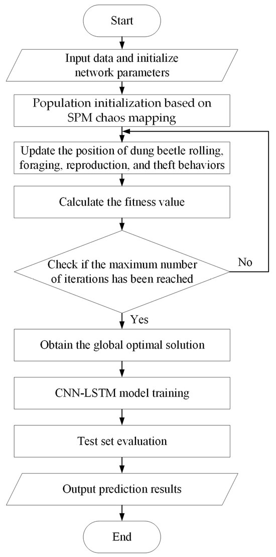 The proposed model combines the local feature extraction capability of CNNs with the complex relationship modeling ability of LSTM [25], while utilizing the MDBO algorithm to optimize network hyperparameters, forming an end-to-end prediction framework. In the prediction of node carbon emission factors for power systems, the MDBO algorithm is applied to optimize hyperparameters in the CNN-LSTM model, including the learning rate, number of convolutional kernels, number of LSTM hidden units, number of fully connected layer neurons, and batch size, thereby enhancing the model’s prediction accuracy. It is worth mentioning that deep hybrid models face inherent overfitting risks in high-dimensional power system scenarios. As a consequence, the dropout rates are set in LSTM and fully connected layer neurons to suppress potential overfitting risks. The hyperparameters of the CNN-LSTM model are assigned to the position of the dung beetle individual in MDBO, while the loss value of the CNN-LSTM model is defined as the fitness variable. During MDBO initialization, the position vector of each dung beetle individual is randomly initialized as a set of hyperparameter values. Throughout the optimization process, positions are updated through social behaviors such as rolling and stealing. The fitness variable is utilized to evaluate the quality of each hyperparameter combination, seeking the optimal hyperparameters that minimize the loss. Ultimately, the globally optimal position of MDBO is used as the optimal hyperparameter for the CNN-LSTM model.
