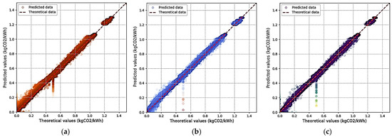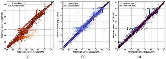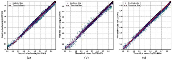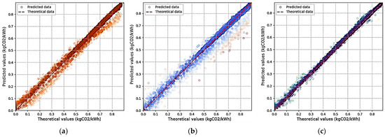 Predicted and theoretical carbon emission factor scatter plots for (a) 35.7%, (b) 54.6%, and (c) 13.3% renewable energy installation ratios in 30-bus power system.