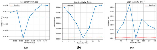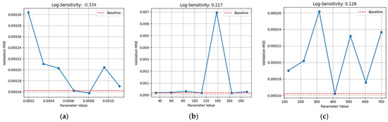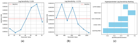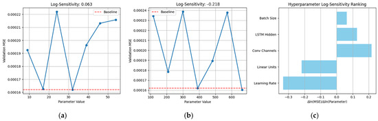 To ensure the robustness of the MDBO-CNN-LSTM model and propose applicable ranges for future power system applications, we conducted a systematic sensitivity analysis on five key hyperparameters of the proposed model for identifying the most influential hyperparameters on model performance, including the learning rate, number of convolutional kernels, number of LSTM hidden units, number of fully connected layer neurons, and batch size. The sensitivity analysis adopts a single-variable perturbation strategy: for each hyperparameter, seven values within a ±70% range of the best value are scanned. During each scan, other parameters are fixed at their optimized values. Each configuration is evaluated using three random seeds to reduce variance [31]. The calculation formula for the log-sensitivity score is as follows: