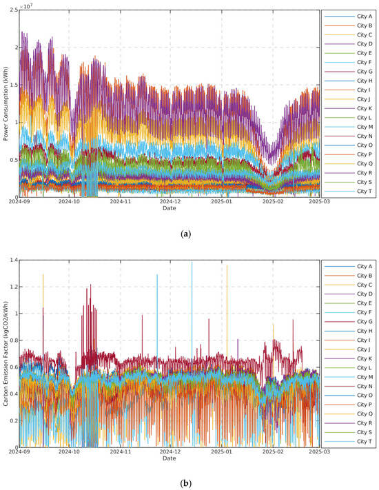 Actual measurement data for 20 cities in Guangdong Province in China on (a) power consumption and (b) carbon emission factor.