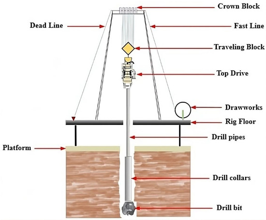 These heavy pipes are located near the lower part of the drill string and form part of a component known as the bottom hole assembly (BHA), which is responsible for providing the necessary weight. Regarding the rotation of the drill pipes, previously, and around the 1980s and 1990s, all drilling rigs used a rotary table driven by an electric motor [22]. However, with advancements in the petroleum industry, a new rotation mechanism called the top drive appeared. As a result, most drilling rigs are currently equipped with both a top drive and a rotary table. Thus, rotation is transmitted from the rotation system to the heavy pipes and the bit through the drill pipes. In addition to weight and rotation, the circulation system uses high-pressure mud pumps to inject and return drilling fluid, which carries rock cuttings to the surface, cools the bit, maintains wellbore pressure, and provides geological information. Well control systems manage the formation fluid intrusion using blowout preventers and circulation methods [23]. Continuous monitoring of drilling parameters, such as weight on bit, depth, rotation speed, torque, pump pressure, and flow rate, is essential for safe and efficient drilling operations [8,21].
