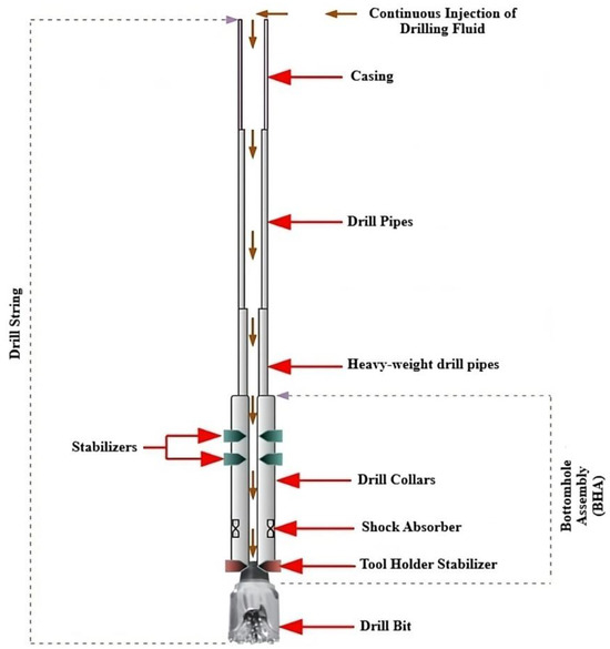 To ensure the stability of the drill string, the transition from drill pipes to drill collars is progressively made by adding heavy-weight drill pipes [1]. The difference in dimensions between the components of the drill string divides it into two parts: one in tension (the upper part) and one in compression (the lower part) [2]. Complex loadings to which the drill string is subjected stimulate the apparition of harmful vibrations and other problems [3]. It has been found that drill string vibrations are the primary cause of drill string premature failure [4], inefficient rock cutting [5], and excessive drill bit wear and deformation [6]. Drill string vibrations can be classified into lateral, axial, and torsional. In each category, there may be a severe case that causes more damage than the simple mode. Bit whirl, bit bounce, and stick-slip are the extreme cases of lateral, axial, and torsional vibrations, respectively.
