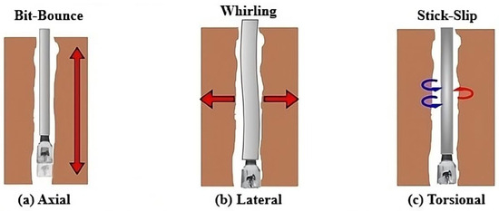 Each vibration mode is caused by a triggering event. The axial mode is caused by the loss of contact between the bottom of the hole and the bit, which leads to the bit experiencing rebounds (bit bouncing), Figure 3a. The lateral mode is caused by the eccentric rotation of the drill string (whirling), Figure 3b. The final mode, which is the most damaging form of vibration, is governed by friction forces existing between the bit and the rock formation, Figure 3c. It has been observed that the appearance of one vibration mode can lead to the occurrence of other vibration modes, resulting in coupled vibration modes [11]. According to field observations, axial vibrations, once generated, tend to produce lateral vibrations, especially at the level of the BHA [1], while lateral vibrations in turn can cause axial and torsional vibrations [12]. Broadly speaking, three coupled vibration modes can occur during drilling: axial–lateral, lateral–torsional, and axial–torsional.