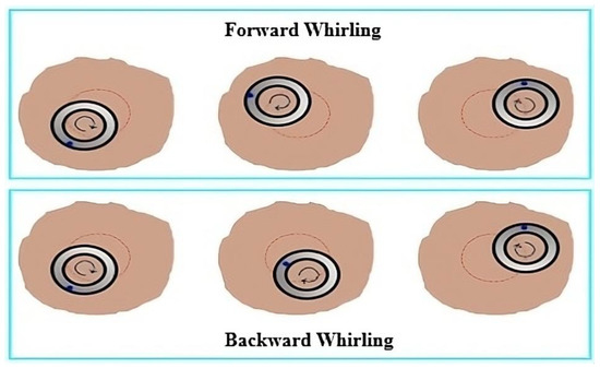 The rotation of the drill string, and more specifically the bottom hole assembly (BHA), involves interactions with the wellbore walls. As the frequency of these interactions increases, they escalate into very violent impacts, causing lateral oscillations [24]. Indeed, it has been acknowledged that these vibrations are responsible for numerous problems on drilling sites, primarily premature fatigue of BHA components and wear of stabilizers [25]. The severity of lateral vibrations lies in the fact that they generate lateral waves that are undetectable at the surface (waves that do not propagate) [16]. Additionally, these vibrations, through their lateral waves, can induce bending in the BHA [26]. The triggering factor of lateral vibrations is the center of gravity of the heavy-weight drill pipes [16]; if, at the initial moment, this center is slightly offset from the wellbore axis, its rotation creates a centrifugal force acting at the center of gravity, thereby accelerating lateral oscillations. Furthermore, as shown in Figure 4, two movements can accompany the occurrence of lateral vibrations [17]: forward whirling and backward whirling. Forward whirling occurs when the BHA, assumed to deviate from the wellbore axis, rotates in the same direction as the drill bit rotation [22]. The other movement occurs when the BHA rotates in the opposite direction to the drill bit rotation. Moreover, it is fair to say that all drilling tools directly influence the occurrence of lateral vibrations; for this reason, both PDC and roller cone bits can be subject to them [27]. At very high rotation speeds, and due to mass imbalances and forces created by the BHA and the bit–rock interaction, roller cone bits can vibrate laterally and exhibit whirling movements [28].