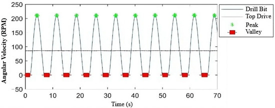 Based on analyses and data collected from sites where torsional vibrations have been observed, it was noted that the stick-slip phenomenon occurs cyclically during 50% of the total drilling time [20], illustrating why torsional vibrations, especially in their severe form (stick-slip), are classified among highly undesirable dynamics. The descending trend of the curve toward the valley, as shown in Figure 5, indicates that the bit enters the stick phase, which lasts for a certain period before suddenly releasing and entering the slip phase. This is indicated by the ascending trend of the curve toward the peak. These oscillations tend to repeat as long as the stick-slip phenomenon persists and remains present [32]. In summary, torsional vibrations and the stick-slip phenomenon are undesirable events that can cause significant damage and thus endanger drilling equipment. Moreover, in terms of impact on the petroleum industry, it has been proven that the stick-slip phenomenon is responsible for