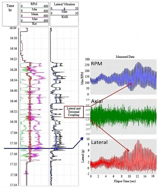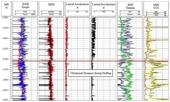 This section explores the modal frequencies of a drill string system with field-acquired measurement while drilling (MWD) data from an Algerian petroleum exploration oil well. Figure 6 illustrates a set of real-time drilling parameters, including torsional oscillation measurements (e.g., downhole angular velocity from a proprietary BlackBox sensor and rotary speed at the surface) and lateral displacement amplitudes (measured in terms of peak and root-mean-square values). Other logs of Figure 6 include WOB, surface Torque-on-Bit, ROP, Gamma Ray (GR), Mechanical Specific Energy (MSE), and computed Critical Compressive Strength (CCS) profile. One of the interesting observations from these logs at a depth of 1710 m is an increase in MSE and GR and a decrease in ROP, all occurring simultaneously. This intersection of the drilling signals postulates potentially coupled vibratory effects on the BHA. To further define this postulated dynamic interaction, a comprehensive time-domain analysis of downhole torsional, lateral, and axial accelerations was performed, presented as a function of burst acquisition time in Figure 7. It presents the frequency characteristics of the dynamic behavior of axial, torsional, and lateral vibrations observed in the drill string during drilling.