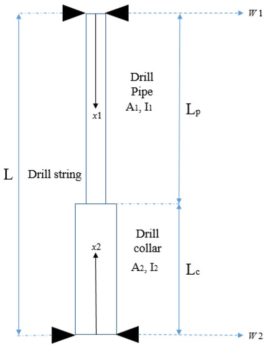 This section introduces the analytical models for lateral, axial, and torsional vibrations, which were developed to assess the reliability of finite element models in estimating the natural frequencies of the drill string. Each analytical model is formulated separately based on Newton’s second law and Hamilton’s principle [24]. The drill string is approximated as a stepped beam with two different cross-sections and lengths, as shown in Figure 8. Stress concentration at the interface between the drill pipe and drill collar is neglected. In addition, continuity boundary conditions at the interface are verified and satisfied.