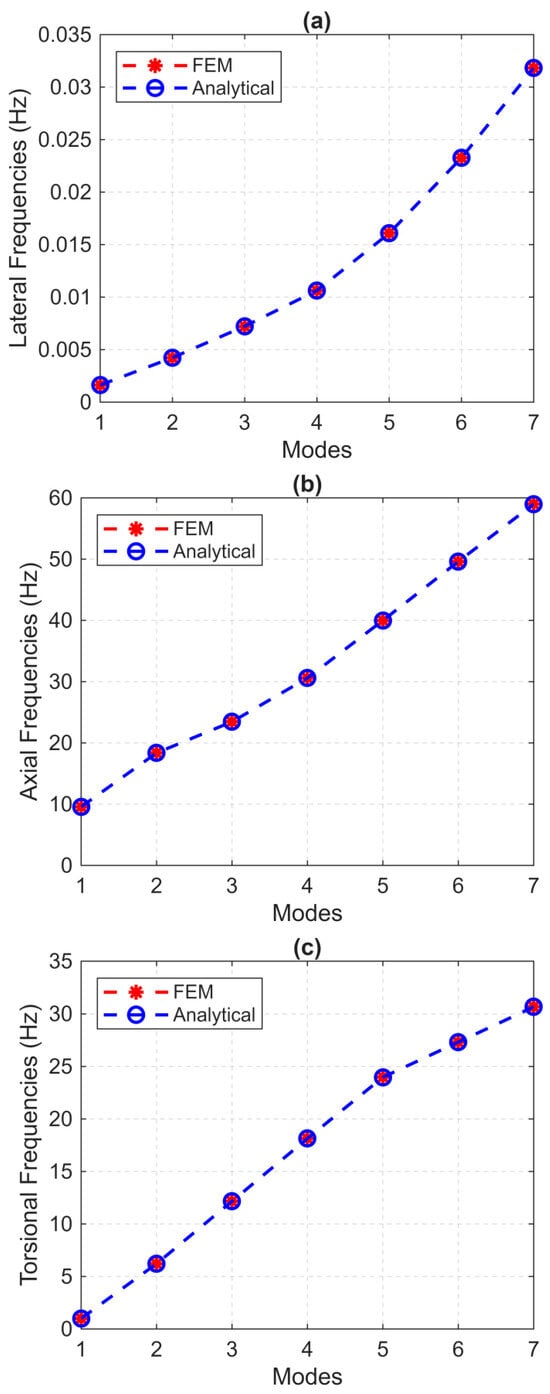 Natural frequencies estimation from FEM and analytical models: (a) lateral, (b) axial, and (c) torsional vibrations.