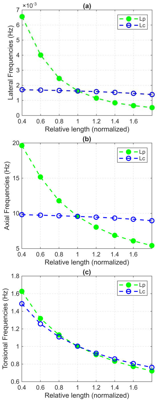 Increasing the total drill pipe and drill collar length from 0.4 to 1.8 affects the lateral and axial natural frequencies. A decrease of 10.54% in the axial natural frequency was obtained against 11.53% in the lateral natural frequency. This can be interpreted by the fact that as the length of drill collars increases, the ratio length to weight tends to be constant, leading to slight changes in natural frequencies. For the torsional vibration mode, the natural frequencies of drill collars follow the same descending curve as those of drill pipes as the total length increases. A 3.34% decrease in the torsional natural frequency was observed. It must also be noted that the variation in the relative normalized length of the drill pipe has not a considerable effect on the first natural frequency of torsional vibrations when compared to lateral and axial vibrations. This is mainly due to the nature of torsional dynamic, which is directly related to the rotational behavior of the drill string and the applied surface torque regardless of the drill string length and configuration.