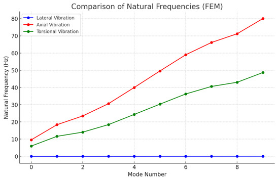 Based on the results obtained from Figure 11, the natural frequency analysis of the drill string under coupled axial–torsional–lateral vibrations indicates that both analytical and numerical models yield similar results. Specifically, axial vibrations tend to dominate over torsional and lateral vibrations. Therefore, it is highly recommended to consider high-frequency coupled axial–torsional–lateral vibrations in the design and analysis of drill strings. Resonance phenomena, where vibration frequencies overlap with natural frequencies, can lead to unexpected and uncontrolled damage to drill string equipment if not carefully and robustly analyzed.