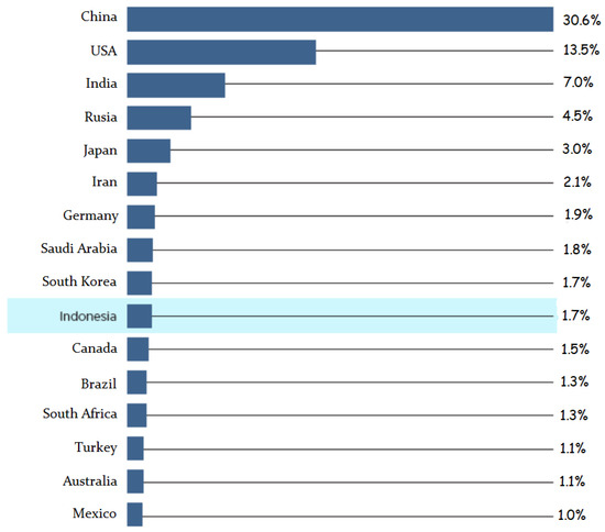 Therefore, efforts to identify global carbon emissions by countries play an important role in providing in-depth insight into the contribution and responsibility of countries to climate change, as presented in Figure 2. The information obtained can help formulate fair, effective, and efficient policies in global efforts to reduce carbon emissions. Countries that produce large amounts of carbon emissions, especially industrial countries, have a greater responsibility to reduce emissions. By identifying the countries that contribute the most emissions, global reduction targets can be focused on sectors and countries that require the most significant changes. This allows for the establishment of mitigation policies that are in accordance with each country’s contribution to global carbon emissions. In addition, the importance of these data also reflects a greater moral responsibility for high-emitting countries to lead efforts to mitigate climate change while ensuring fairness for countries that are more vulnerable to its impacts.