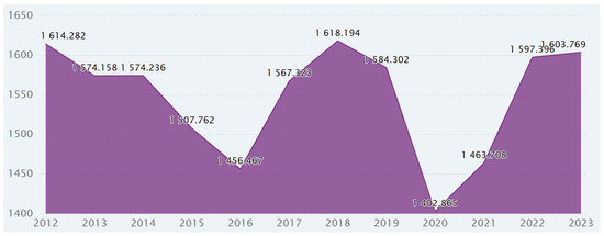 Information on Indonesia’s greenhouse gas (GHG) emissions from 2010 to 2020, shown in Figure 4, has great importance in the context of climate change mitigation, policy formulation, and evaluation of the success of emission reduction efforts. GHG emission data for a decade provide an overview of the development of Indonesia’s emissions over time. By monitoring trends from 2010 to 2020, we can see emission patterns from various sectors, such as energy, transportation, forestry, agriculture, and waste. It is important to identify whether efforts that have been made, such as greening, renewable energy, and energy efficiency, have succeeded in reducing emissions or failed [72]. Steps to find out greenhouse gas emissions are an important tool in understanding emission developments, assessing the effectiveness of climate change mitigation policies, and determining the next steps to achieve national and international emission reduction targets. These data help ensure that Indonesia moves towards a low-carbon economy in an effective and equitable manner while maintaining economic growth and public welfare. This explanation plays an important role in future development because it provides a scientific and strategic basis for designing more targeted and sustainable climate change mitigation policies. By understanding the trend of Indonesia’s greenhouse gas (GHG) emissions during the 2010–2020 period, the government and stakeholders can evaluate the effectiveness of various programs that have been implemented, such as the adoption of renewable energy, energy efficiency, and forest rehabilitation. These data are also important for identifying sectors with high emission contributions and for setting intervention priorities. Furthermore, this information strengthens Indonesia’s position in international cooperation and supports efforts to achieve the Nationally Determined Contributions (NDC) targets. In the future, the use of these data will enable the formulation of evidence-based policies that not only significantly reduce emissions but also encourage inclusive and equitable economic development in the context of the transition to a green economy. Efforts to support data completeness, Indonesian oil consumption data is needed to consider carbon tax rates referring to CEIC Data shown in Figure 5.
