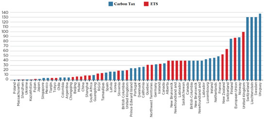 Carbon price comparison, adapted from State and Trends of Carbon Pricing 2022 [46].