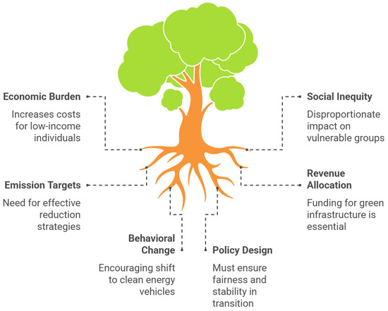 This study highlights the importance of implementing a carbon tax in the transportation sector as a strategic step in reducing greenhouse gas emissions [48] and supporting sustainable development [49] in Jakarta and other major cities in Indonesia. Although regulations related to carbon taxes have been issued, their implementation is still not optimal, mainly due to the lack of clarity in calculating carbon tax rates [50] in accordance with Indonesia’s social, economic, and environmental conditions. In the context of the transportation sector, the implementation of a carbon tax can provide several key benefits, including reducing air pollution [51], accelerating the transition to renewable energy [52], increasing investment in green technology [53], and financing the development of more environmentally friendly transportation infrastructure [54]. Carbon taxes function as economic instruments that provide incentives for companies and individuals to switch to low-carbon solutions such as electric vehicles and clean energy-based public transportation [55].