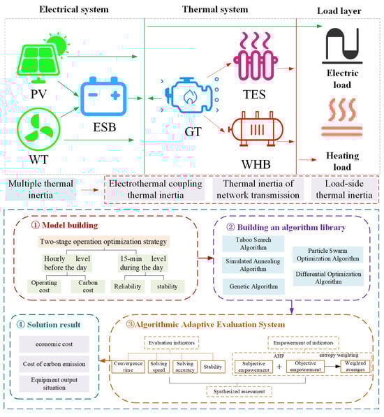 As shown in Figure 1, the core framework of model construction and solution in this paper contains four key parts. First, a two-stage optimization model of IES based on multidimensional thermal inertia is established: hourly optimization is performed in the pre-day stage, aiming at economy and environmental protection; 15 min optimization is performed in the intra-day stage, focusing on improving the reliability and stability of the system. Second, a library of solution algorithms containing five algorithms, including the Taboo Search Algorithm and Simulated Annealing Algorithm, is constructed. Third, an algorithm adaptive evaluation system is developed for the multi-timescale scheduling of integrated energy systems considering thermal inertia response, which can adaptively select the most suitable algorithms according to specific scenarios and output system optimization strategies. Fourth, the validity of the model and algorithm is verified through example simulation, and the solution results of the objective function are output.