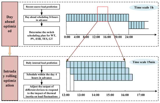 Considering that multi-dimensional thermal inertia can respond to users’ needs on different time scales, this paper designs a two-stage operation optimization model of IES considering multi-dimensional thermal inertia to ensure efficient utilization of resources and reduce the economic operation cost of the system. The specific optimization strategy is shown in Figure 2, which is divided into two stages. Hours before the day and 15 min minutes within the day.