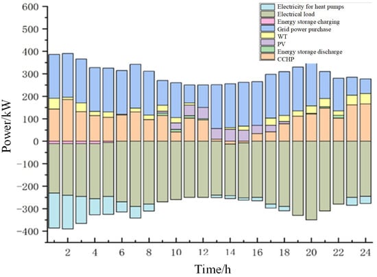 where , , respectively are the output of the gas turbine, fan, and photovoltaic at time t, kW, are the discharge and charging power of the energy storage battery at time t, kW, , is the actual output value of the electric and heat load, kW, , are the electric and thermal load output prediction error, kW, is the output of the waste heat boiler at time t, kW. Respectively, , are the heat release and charging power of the heat storage tank at time t, kW, is the low calorific value of natural gas, kWh/m3, and is the natural gas volume consumed by the gas turbine at time t, m3.