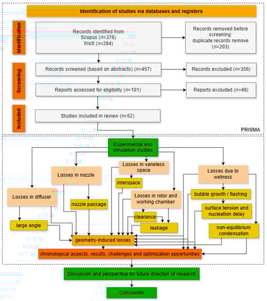 The full-text versions of these 101 articles were collected and underwent a comprehensive evaluation. This phase tried to evaluate each study’s methodological quality, analytical depth, and relevance in relation to the review’s primary research questions. Inclusion criteria for articles required the presentation of original research on two-phase expansion processes and related losses, experimental, computational, or theoretical methodologies, and detailed quantitative or qualitative analyses concerning efficiency, performance decline, or thermodynamic behavior. Studies were excluded for insufficient methodological accessibility, irrelevant treatment of loss phenomena, or lack of loss-specific data or insights. As a result of this thorough assessment, 49 studies were excluded. In this case, 52 articles fulfilled all inclusion criteria and were classified as high quality, which results in the final dataset for thematic classification and synthesis in the subsequent stages of this review.
