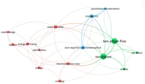 Figure 2 shows the thematic clustered results of keywords based on the co-occurrence analysis from 52 publications into three color keyword clusters that describe the topic related to the two-phase expansion process and losses. The green cluster may explain the phase change as it consists of keywords such as two-phase flow, nucleation, droplet, and wet steam. It may emphasize how interfacial dynamics and bubble/drop evolution govern energy conversion during rapid depressurization or flashing flow (i.e., two-phase expansion process). Moreover, the red cluster consists of mass transfer, entropy, exergy, thermodynamic loss, energy efficiency, ejector, and nozzle design. This cluster may focus on macroscopy mechanisms on the device performance, like the development of nozzle geometry, ejector entrainment, and the schematic, which may mitigate expansion inefficiencies. Furthermore, the blue cluster highlights low temperature operation, which includes keywords such as cryogenic, spontaneous condensation, and non-equilibrium condensation. These three clusters explain the fundamental phase-transition behavior (green), thermodynamic and system loss (red), and the boundary case phenomena of the model for low-temperature applications (blue). This co-occurrence map does not yet clarify insights across clusters; only some links connect nucleation studies to entropy-generation metrics used in optimization, for example. There is still a lack of clarity in the keyword analysis that connects to the two-phase expansion losses.