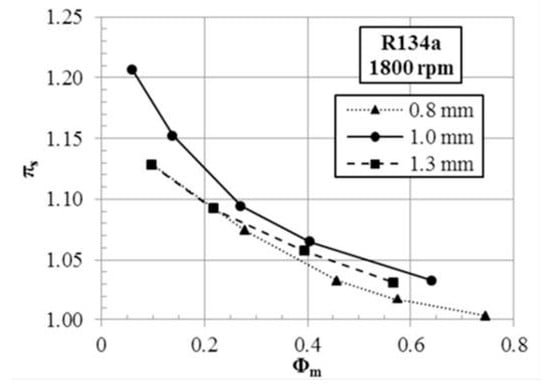 In 2013, Lawrence and Elbel [23] investigated energy losses in two-phase ejector cycles using low-pressure refrigerants (R134a and R1234yf). The study focused on the motive nozzle using an experimental approach. The study results indicated that nozzle throat diameter affects ejector performance. Figure 3 depicts the effect of the nozzle diameters of 1.0, 0.8, and 1.3 mm on the ϕm. The nozzle performance was not linear, with underexpansion or overexpansion, which caused a reduction in entrainment efficiency. The 1.0 mm nozzle throat offered optimal conditions between mass flow and expansion with a 5 mm diameter and a 60 mm length of the mixing section. The smaller diameter can obtain higher pressure ratios, but is less effective at higher flow rates. Furthermore, the larger diameter might allow higher flow but fails to maintain the required pressure recovery. The study suggested that careful nozzle design is essential to minimize losses and improve overall cycle efficiency. Further research was employed by Liu and Yu [24] through a theoretical model using one-dimensional constant-pressure mixing and homogeneous flow. By varying the evaporating temperature (from −65 °C to −40 °C), the ϕm increased from 0.297 to 0.396, while the pressure lift ratio decreased from 3.06 to 1.89. These findings demonstrated that entrainment performance can enhance ejector efficiency and improve the COP of the system.