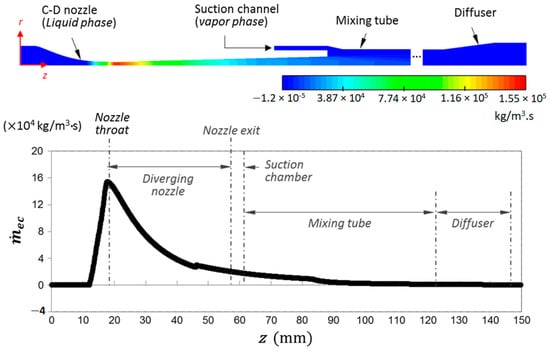 Contour of phase transition rate and its profile for the novel geometry ejector, reproduced with permission from [29]. In this figure, positive and negative values indicate evaporation and condensation rates, respectively.