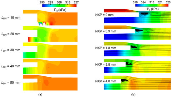 The simulation results of (a) mean static pressure in and around the suction chamber with different diverging nozzle lengths and (b) streamlining the contour of the mean static pressure with different nozzle exit locations [29].