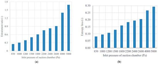 Effect of the suction chamber pressure nozzles on (a) ϕm and (b) entropy loss [30].