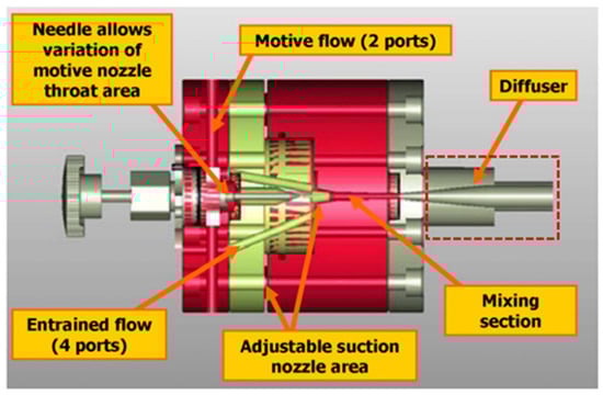 - Zhu, J.; Elbel, S. A New Control Mechanism for Two-Phase Ejector in Vapor Compression Cycles for Automotive Applications Using Adjustable Motive Nozzle Inlet Swirl. SAE Int. J. Passeng. Cars-Mech. Syst. 2016, 9, 44–51. [Google Scholar] [CrossRef]